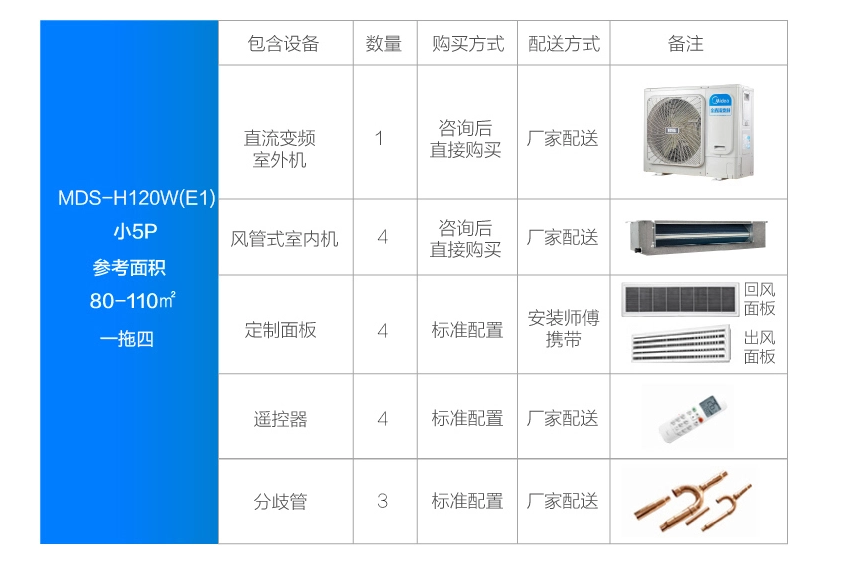 室外機安裝說明書*1、室外機使用說明書*1、室內機使用說明書*1、美的家庭中央空調安裝竣工報告書*1、出水管接管*1、網絡匹配線組*2、用戶服務指南*1、連接管(適用于16KW機型)、L型管(適用于10~14KW機型) |