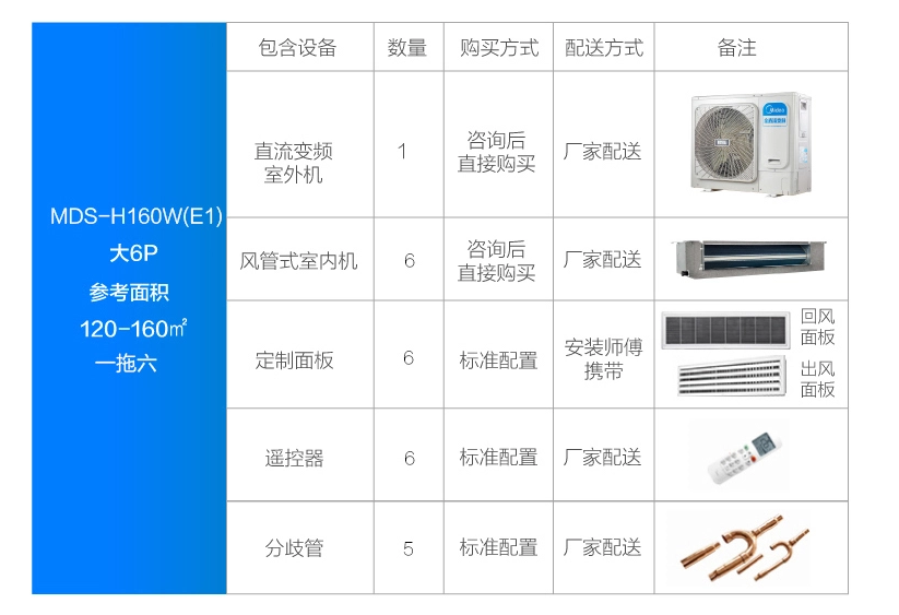 美的 一拖六變頻一級能效 多聯風管機大6匹 家用中央空調 MDS-H160W(E1)