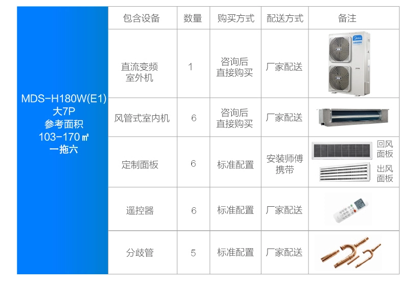 美的 一拖六變頻一級能效 多聯(lián)風(fēng)管機(jī) 7匹 家用中央空調(diào) MDS-H180W(E1)